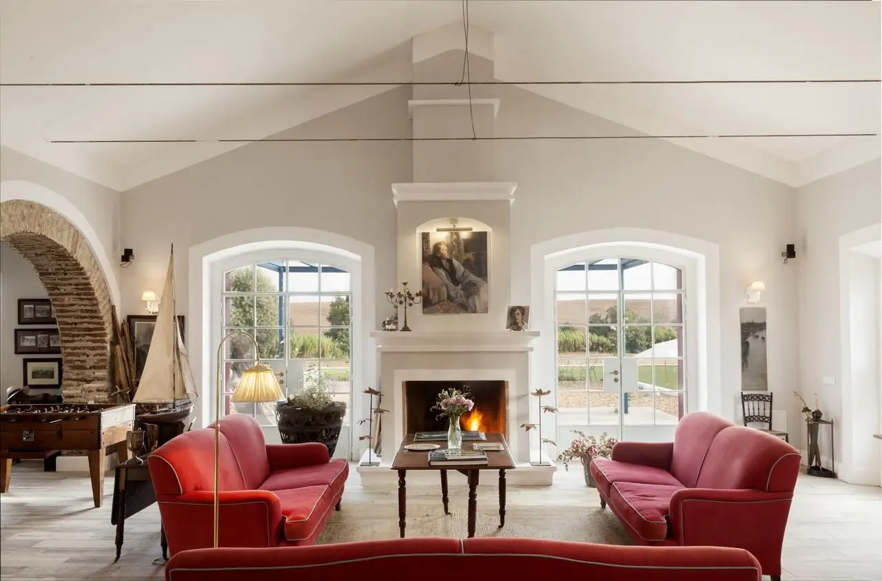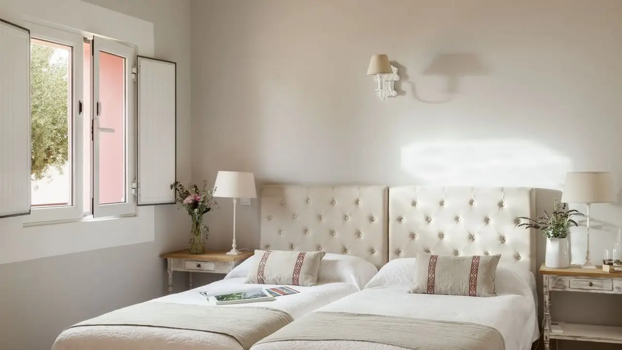 Agora sim, façamos a descrição dos edifícios. O do lado direito acomoda os oito quartos (a partir de €120). Todos beneficiam da luminosidade do Alentejo. As respetivas entradas estão ornamentadas com um telheiro feito em metal pintado de azul e as portas numeradas. Quatro são suites familiares com mezaninos; dois estão na categoria de quartos superiores; e a restante dupla são double rooms. Os tons bege, cru e branco predominam a decoração acolhedora da autoria de Pilar del Cuvillo, condessa das Cinco Torres. A arquitetura de interiores esteve, por sua vez, a cargo de Maria del Cuvillo, a filha do casal. A casa da família, contígua ao último quarto, tem um terraço que pode ser desfrutado pelos hóspedes ávidos de descanso e de boas leituras.
