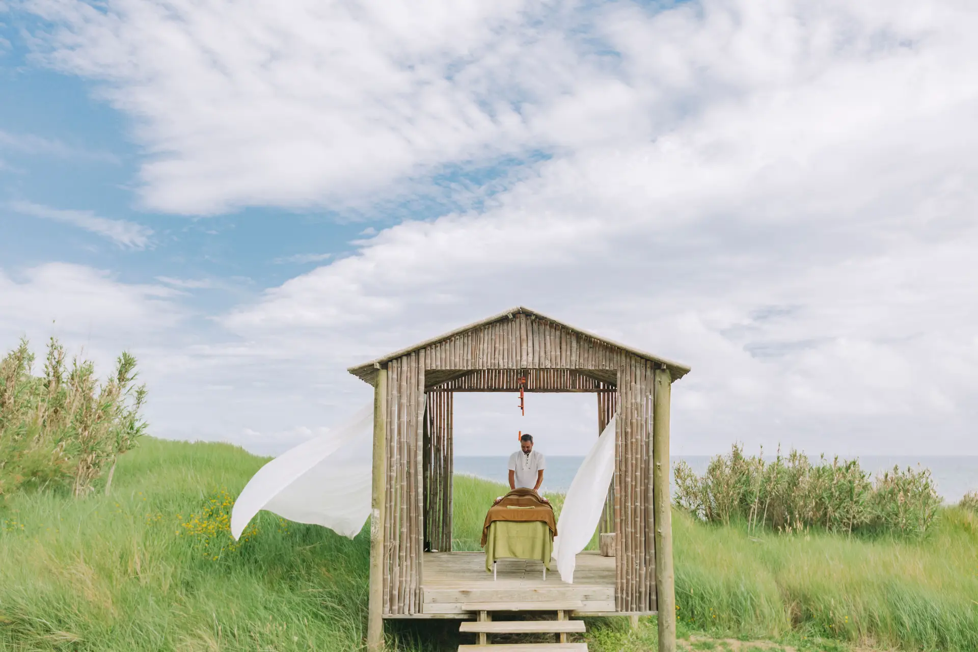 Estava tudo pronto. Toalhas dobradas na marquesa, óleos essenciais, os cortinados balançando entre os bambus da cabana. “Com música ou a ouvir o mar?”, indaga Ricardo Sousa, do Keep Moving Project. “Gosto das duas coisas...”. Dito e feito, segue a massagem, num misto de relaxamento e exercício, segundo princípios e técnicas orientais. Ouve-se o gongo, pairam fragrâncias envolventes e no fim bebe-se uma infusão natural, olhando o azul vivo do mar a fundir-se com os verdes da vegetação e da montanha. Sublime... Para Ricardo, só faz sentido associar-se a projetos como o Santa Bárbara Eco-Beach Resort, em que se celebra a natureza a todo o momento.