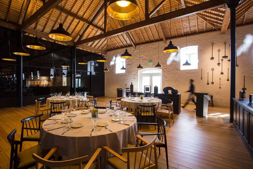 Este jantar especial começa no ambiente escuro e tons quentes das Caves Graham’s. As pipas de vinho do Porto comunicam visualmente com a sala de refeições e são a introdução perfeita para uma noite singular. Será servido um welcome drink ao som de um miniconcerto da violinista russa Ianina Khmelik, membro da Orquestra Sinfónica da Casa da Música, e da acordeonista Fátima Santos, membro do grupo “As 3 Marias”.