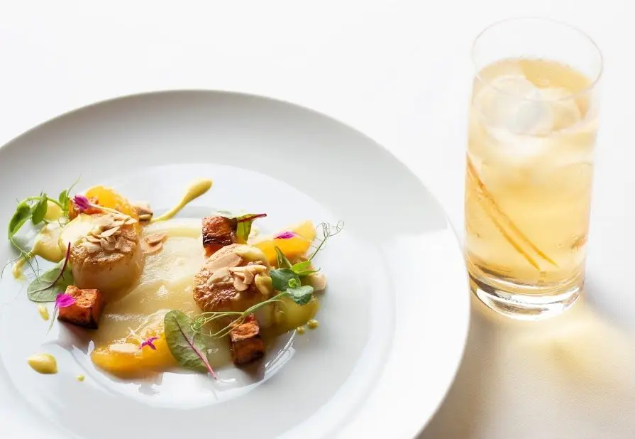Depois das boas-vindas, o primeiro ato inspira-se nos sabores outonais: Servido na companhia de um aperitivo fresco, ideal para abrir o palato, o Taylor’s Chip Dry tónico casa com Vieira sobre pera rocha cremosa, abóbora assada, laranja, mini acelga, amêndoa do Douro tostada e molho de caril. O prato é guarnecido com rúcula.