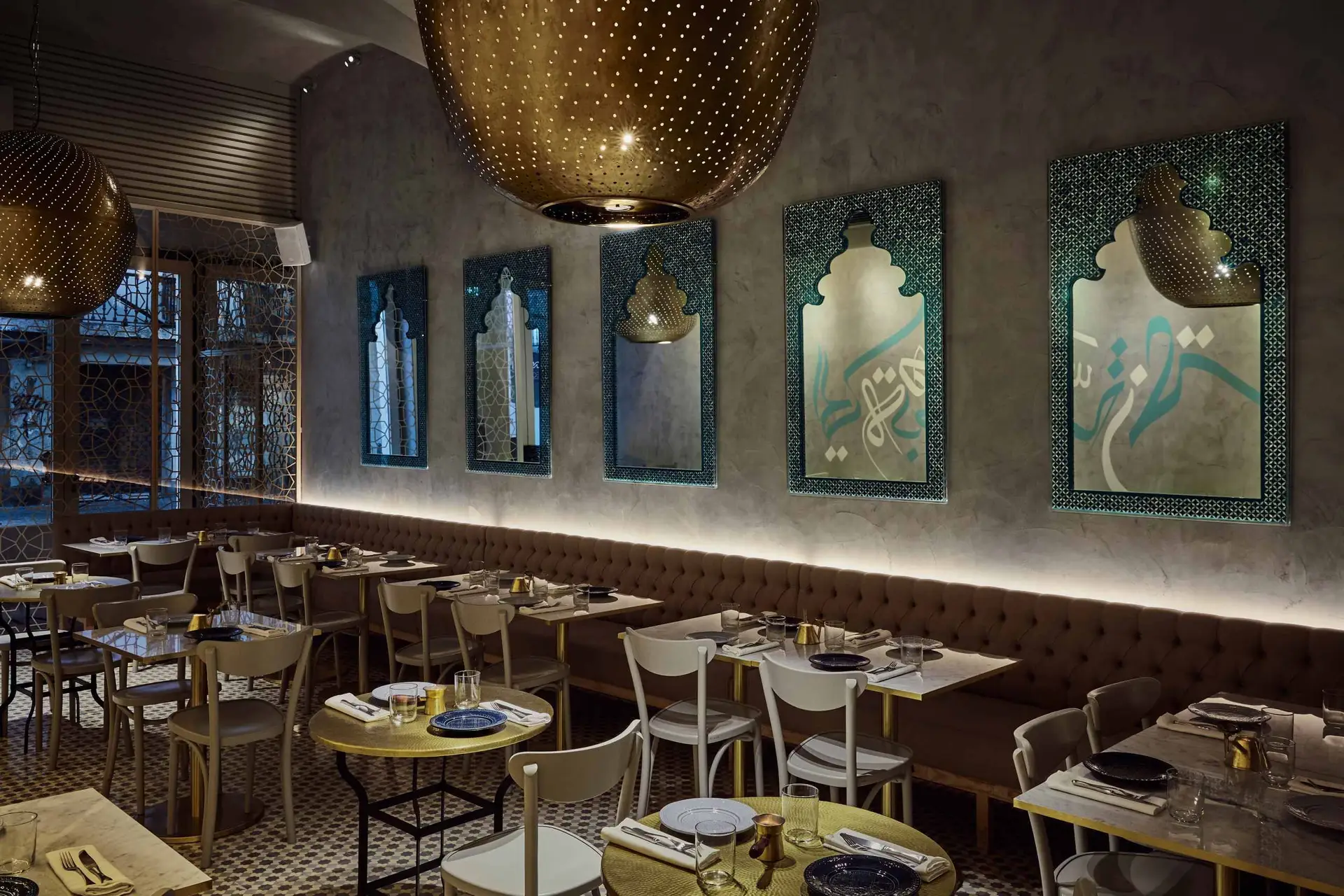 O espaço combina um ambiente moderno com apontamentos orientais, como os espelhos, os candeeiros dourados, os desenhos na parede, entre muitos outros detalhes. A decoração do restaurante Za’atar (Rua de São Paulo, 24, Lisboa. Tel.211350860) ficou a cargo da designer de interiores libanesa Nayla Khour, que explicou que “a iluminação dispersa e materiais como o latão martelado transportam-nos para a faceta tradicional do Líbano; mas as paredes de cimento, as mesas de mármore e o mural colocam-nos no Líbano moderno e contemporâneo”.