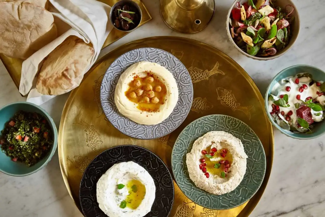 As entradas dividem-se entre Salata (saladas), Mezza frios e Mezza quentes, que combinam pequenos pratos como Baba Ghanough (€3,50) com beringela fumada e assada com tahini e romã, Labneh W Toum (€3) com iogurte libanês com azeite e hortelã, Batata Harra (€3) com batatas crocantes salteadas com alho, paprika, coentros e limão, entre muitos outros.