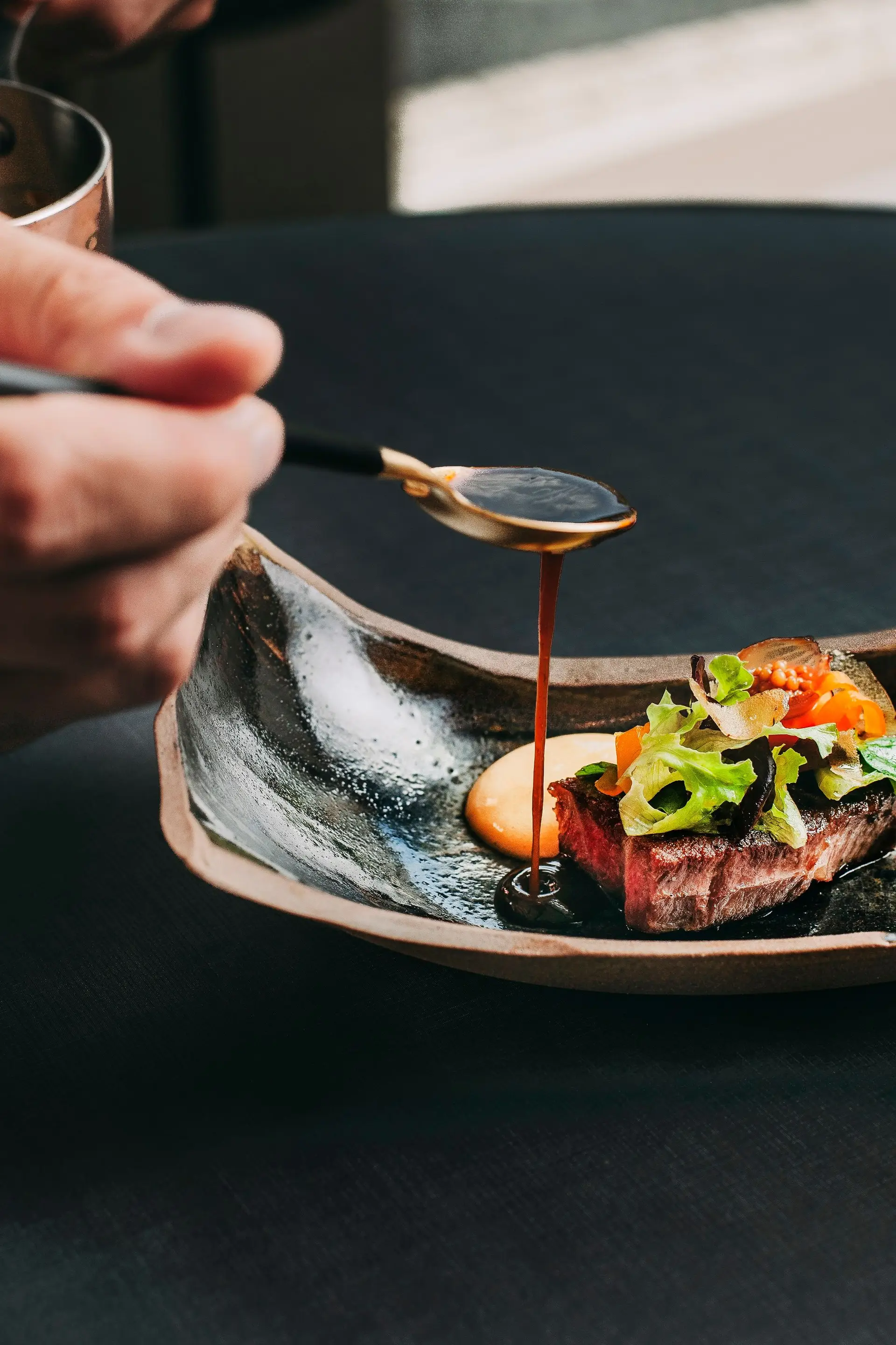 Depois de um "Hassun" bem intenso, vem a Miso Shiro, um caldo ligeiro e aromático, claramente a lembrar uma sopa alentejana, desde logo porque emana um forte cheiro a coentro. É feita de bacalhau, coentros, pimentão fumado e crocante de pele de peixe. A sugestão de maridagem para o vinho, feita por João Fernandes, sommelier, vai para o Colinas Rosé de Pinots NV, tanto para o "Hassun" como para o Miso.