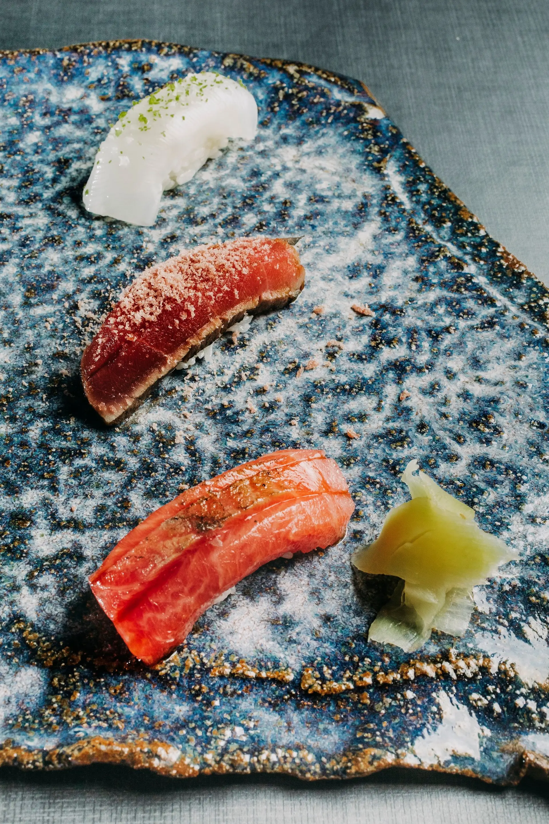 A lula dos Açores volta a estar em destaque neste menu, desta vez na versão nigiri, com sudachi e yuzu (ambos citrinos), formando um trio com os nigiris de atum fumado com muxama e de toro na brasa.
