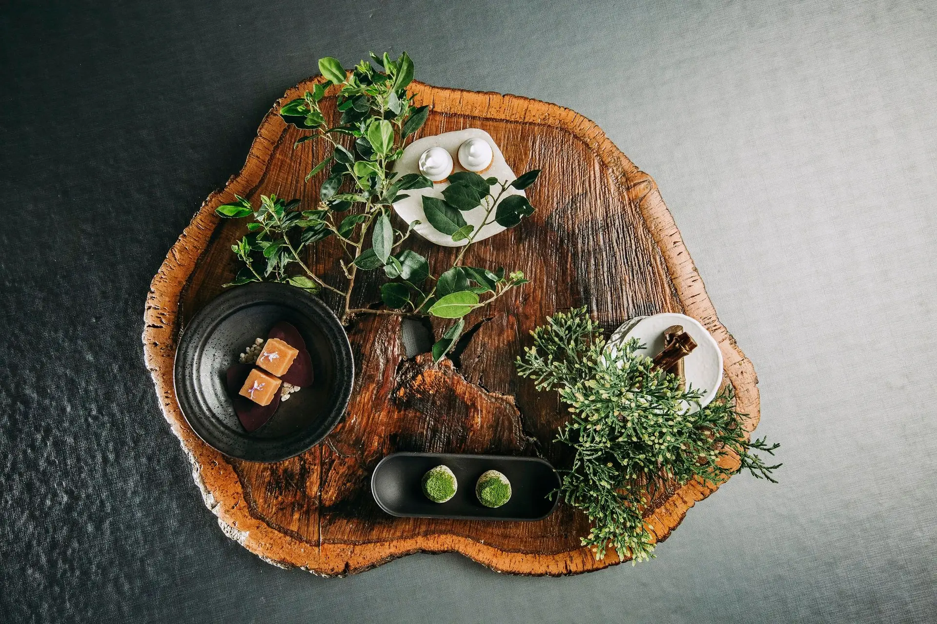 “Hassun”, o primeiro momento do jantar tem a aparência de um pedaço de jardim, servido sobre uma base de um tronco gigante de madeira, com ramos de vegetação da Penha Longa a enfeitar, “salpicado” de sugestões do Chefe. Um Cubo de falso Tofu de Couve-flor, com jus de Salmonete e Yuzu (citrino japonês); um Suspiro de Cogumelos Shitake com “Pipis” e Miso – um prato que o Chefe diz remeter para a respectiva infância por lembrar o escabeche de cogumelos que mãe, originária das Beiras, preparava e uma Cabeça de Camarão frita com Plâncton e aioli de yuzu e Folha crocante de Nori, gema de ovo, cebola caramelizada, caviar e ponzu (molho japonês à base de limão).