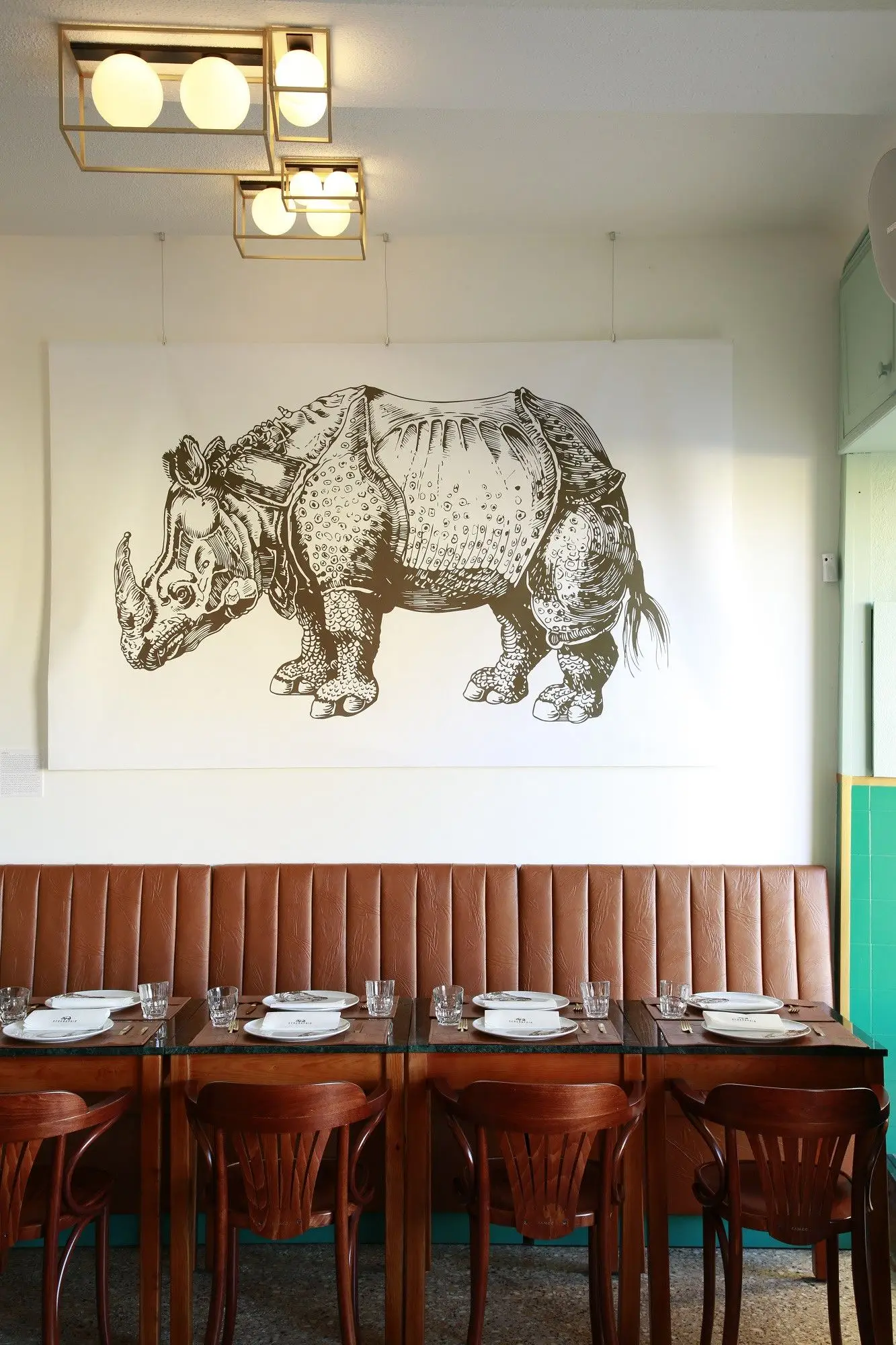 Sobressaem os mapas e a floresta tropical nas paredes, o macaco a trepar a coluna e, sobretudo, o rinoceronte Ulisses, símbolo do “cruzamento de culturas”. Albrecht Dürer desenhou este animal, que foi oferecido pelo Sultão do Gujarat ao governador da Índia portuguesa, Afonso de Albuquerque, e que o enviou depois ao rei Dom Manuel I. Por sua vez, o rei enviou o rinoceronte como um presente para o papa Leão X, em Roma, mas o animal afogou-se quando o navio se afundou na costa da Itália.