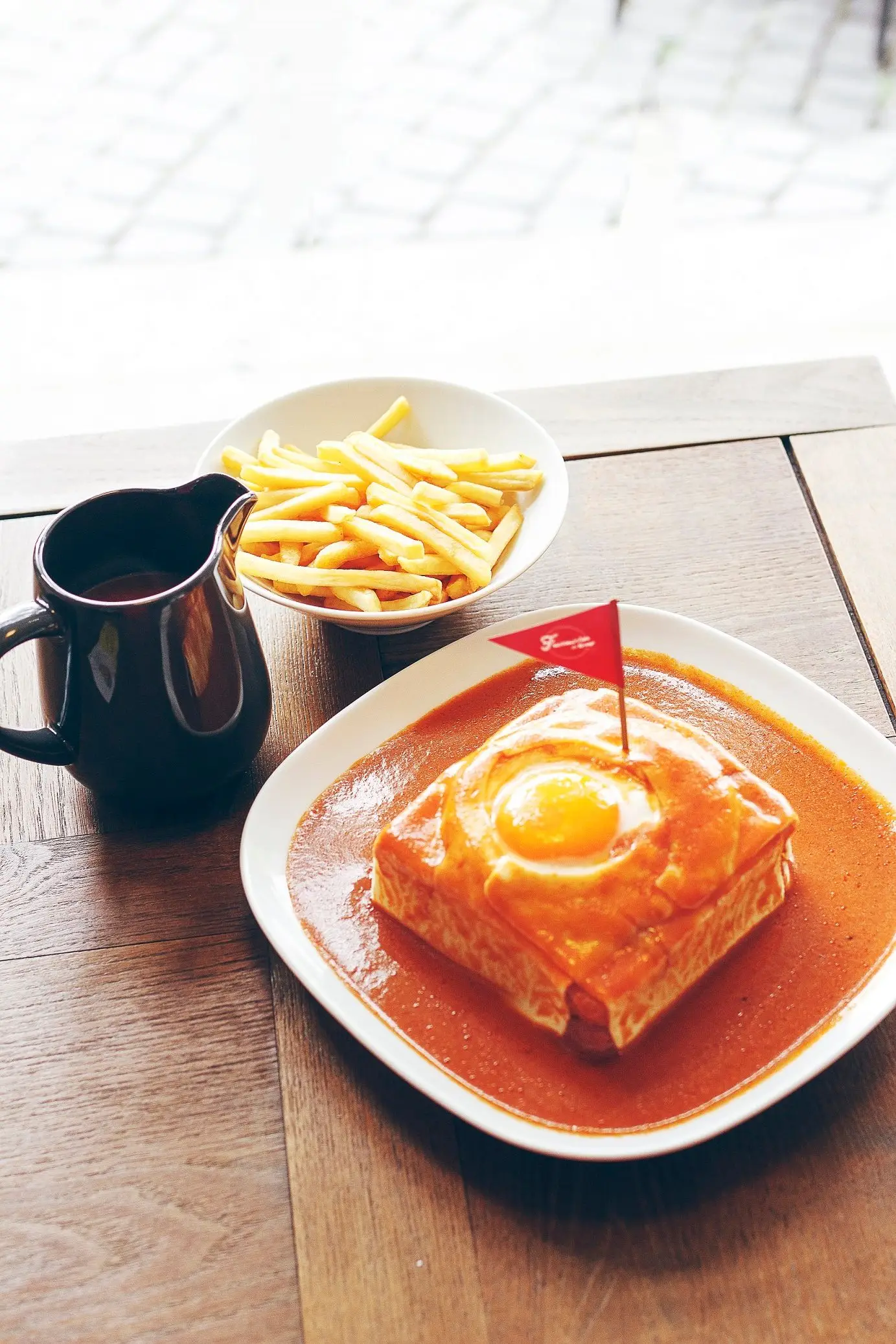 Francesinha (€9) a que se pode acrescentar ovo estrelado (€1), batata fritas (€2) e também molho extra (€2) constituem a ementa restrita do Francesinha du Carago (Rua Augusto Rosa, 57, Porto).