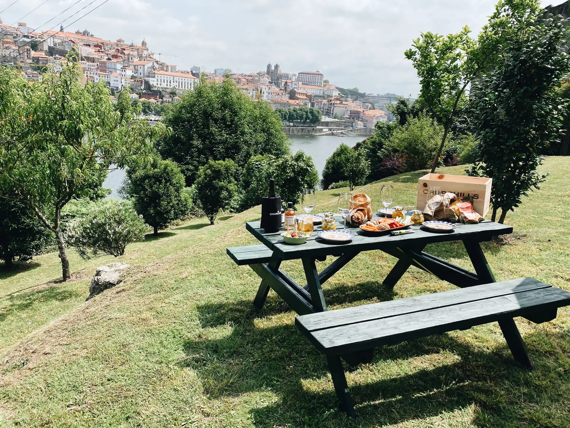 No jardim da Churchill’s, em Vila Nova de Gaia, as caixas de piquenique, feitas a partir das tradicionais caixas de vinho do Porto são preparadas para quatro pessoas. O espaço no jardim está marcado com mesas e guarda-sóis, distanciados, e nas caixas vão queijos da Marinhas e da Quinta da Rigueira, pão de massa lêveda e trufas energéticas do Berry, as compotas da Meia Dúzia ou os frutos secos da Nuts Original. Há opção vegetariana. A partir de €18,75.
