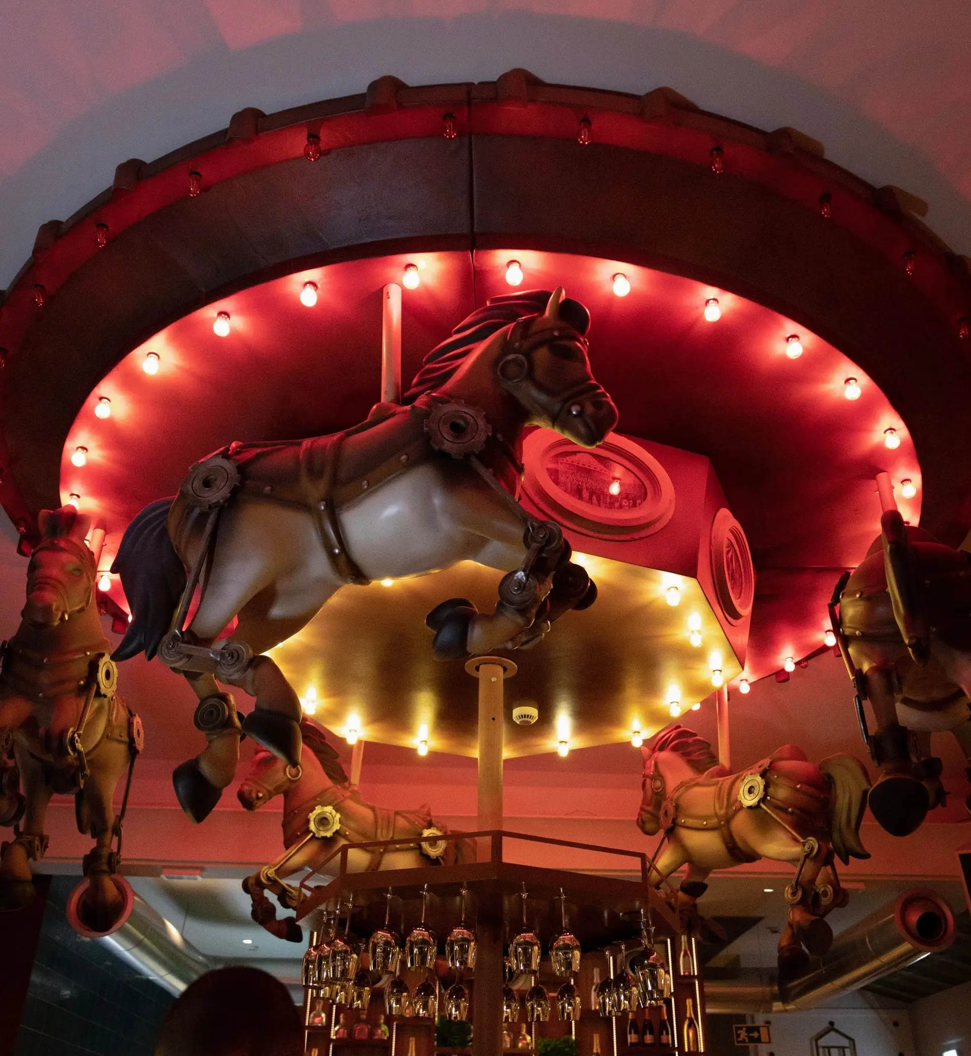 Regressando à porta do Sky Valley Lisboa, não há música, mas o porteiro, muito mais acessível, cumprimenta os clientes e encaminha-os para o elevador, onde carrega no botão para maior higienização e a viagem começa. São apenas dois andares, mas ao abrir as portas, abre-se também um espaço surpreendente, com ambientes distintos, sobressaindo, desde logo, um carrossel no centro do bar, logo a pedir uma fotografia. Depois, há a sala de jantar interior, confortável e elegante, a manter as distancias entre mesas recomendadas pelas autoridades, e há ainda um terraço, agora coberto, mas que promete ser a grande sensação, quando o calor regressar.
