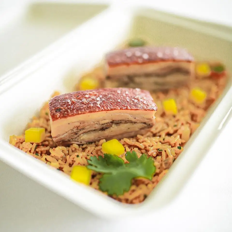 Nos pratos principais destacam-se Bacalhau confitado com batata-doce e azeitonas alentejanas (€20); Fideua de marisco (€20) ou vegetariana (€15); Lombo de novilho Black Angus com gratinado de batata, espargos e molho de vinho da Madeira (€20) e Leitão laqueado com arroz frito de camarão e manga (€18).