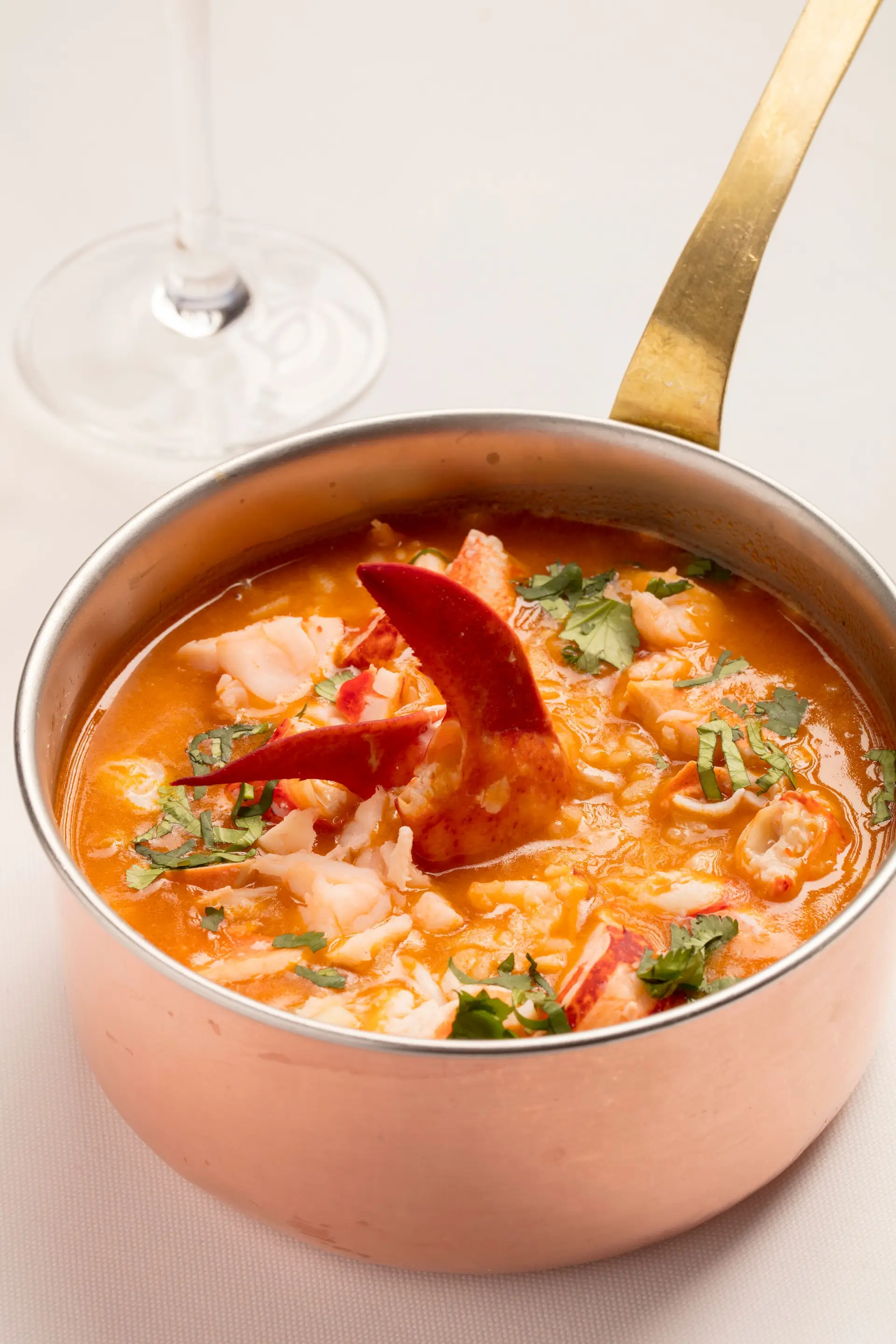 200 g de arroz Carolino; 800 g de cebola; 500 g de cenoura; 100 g de rama de aipo; 15 g de alho picado; 100 ml de azeite; 1 kg de tomate cacho; 1,2 kg de lavagante; 2 l de caldo de lavagante; 100 g de manteiga; 50 ml de vinho branco; 80 g de coentros; 8 g de sal; picante (q.b.) e sumo de limão (q.b.).
