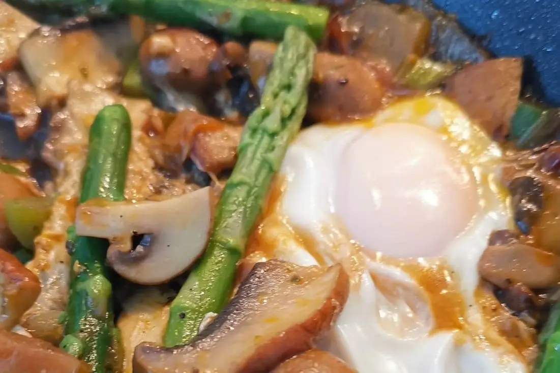 Picar bem a cebola e o alho e refogar em azeite previamente aquecido. À parte, escaldar os espargos em água a ferver. Cortar depois às rodelas, deixando a ponta inteira (cerca de 10 cm). Adicionar as rodelas de espargos à cebola e cozinhar. Cortar os cogumelos em pedaços pequenos e adicionar ao preparado anterior. Misturar tudo muito bem. Acrescentar o tomate, o sal, os orégãos e a pimenta. Envolver tudo bem e adicionar a cerveja sem parar de mexer. Deixar ferver durante aproximadamente um minuto, baixar a temperatura e parar de mexer. Adicionar os ovos e as pontas dos espargos, cobrir com uma tampa e desligar o lume. Deixar repousar cinco minutos ou até o ovo ficar no ponto desejado. Servir com quinoa cozida.